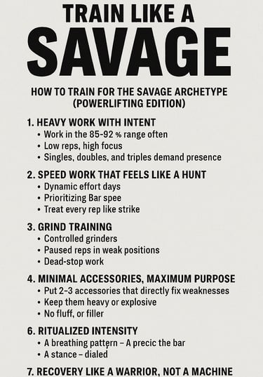 Coaches Tip- You don't earn strength in the gym- you cash it in. Recovery (#7) is where Savage reloads. Prioritize sleep like a training block. Eat like your rebuilding armor on a tank. Stretch as to sharpen steel. The Bar doesn't care how hard you trained- it cares how well you recovered. Stay ruthless about rest. That how a Savage remains dangerous!